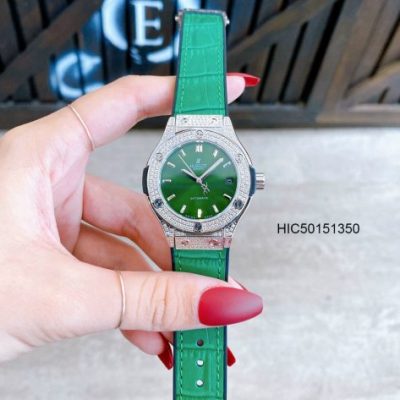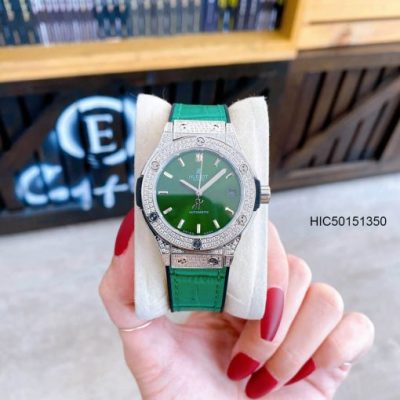 đồng hồ Hublot nữ máy cơ dây màu xanh lá viền đính đá